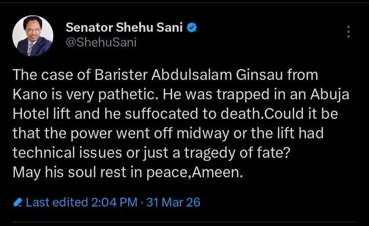 Senator Shehu Sani, widely known for his outspokenness, also pointed out that the death of Barrister Abdulsalam Ginsau was a tragedy of fate.