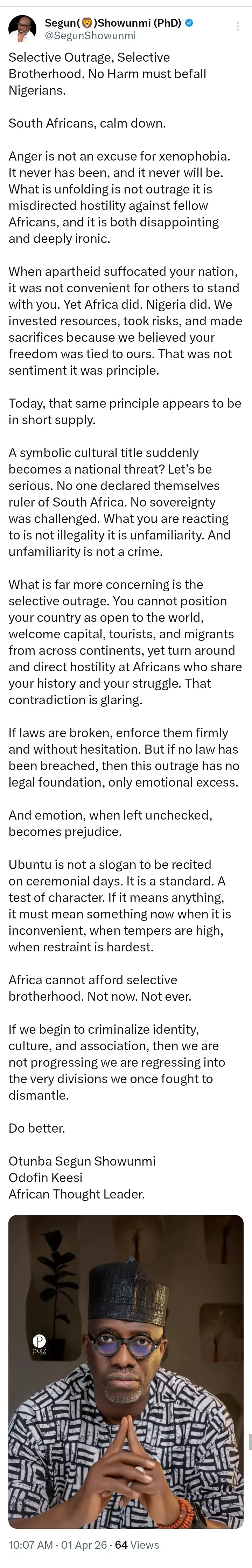 Segun Showunmi has criticized the recent unrest targeting Nigerians in South Africa, describing the reaction as misplaced anger rather than justified concern. He argued that the situation had been blown out of proportion, stressing that no one attempted to take over authority or challenge the country’s sovereignty.