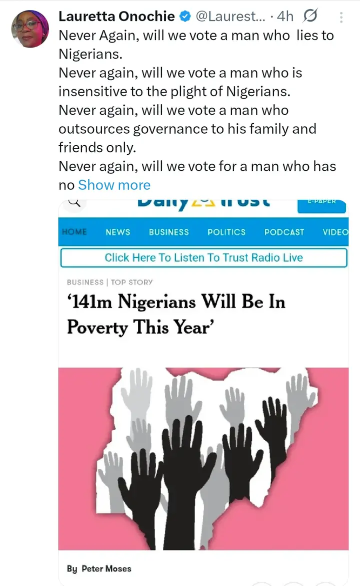 Never Again Will We Vote A Man Who Lies, Outsources Governance, And Disregards Nigerians -Lauretta