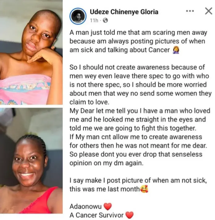 A Nigerian cancer survivor, Udeze Chinenye Gloria, has sparked emotional reactions online after sharing a personal experience on her Facebook page regarding criticism she received over her health advocacy.