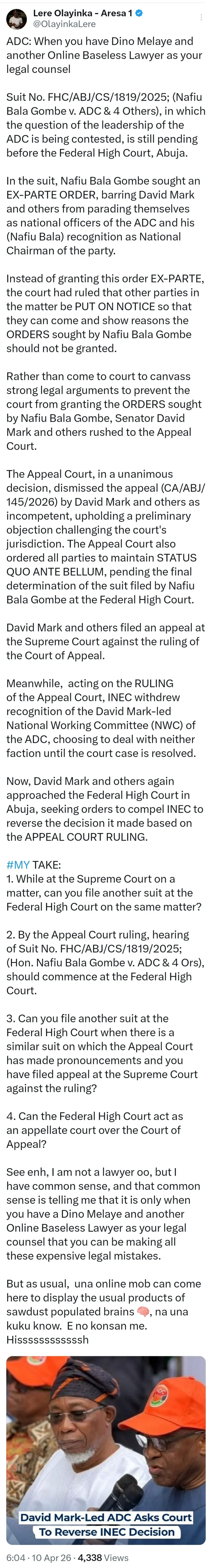 In the post that Surfaced online, Lere Olayinka stated that in the suit filed by Nafiu Bala Gombe, the request was for an ex parte order to restrain David Mark and others from presenting themselves as ADC national officers, alongside a request to be recognised as the party’s National Chairman.