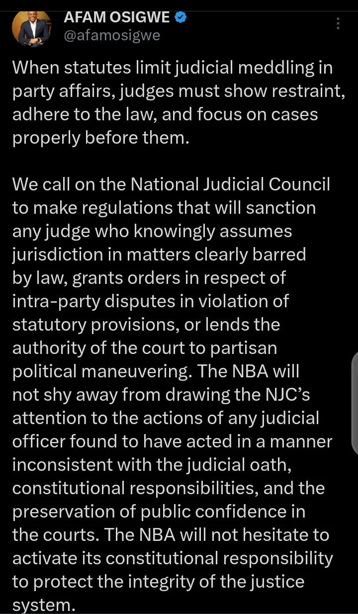 In the statement that Afam Osigwe made on his page, he said Joash Ojo Amupitan is a distinguished Professor of Law. The NBA President advised Joash Ojo Amupitan to ensure that his actions reflect fairness. Afam Osigwe said they are closely monitoring the activities of INEC.