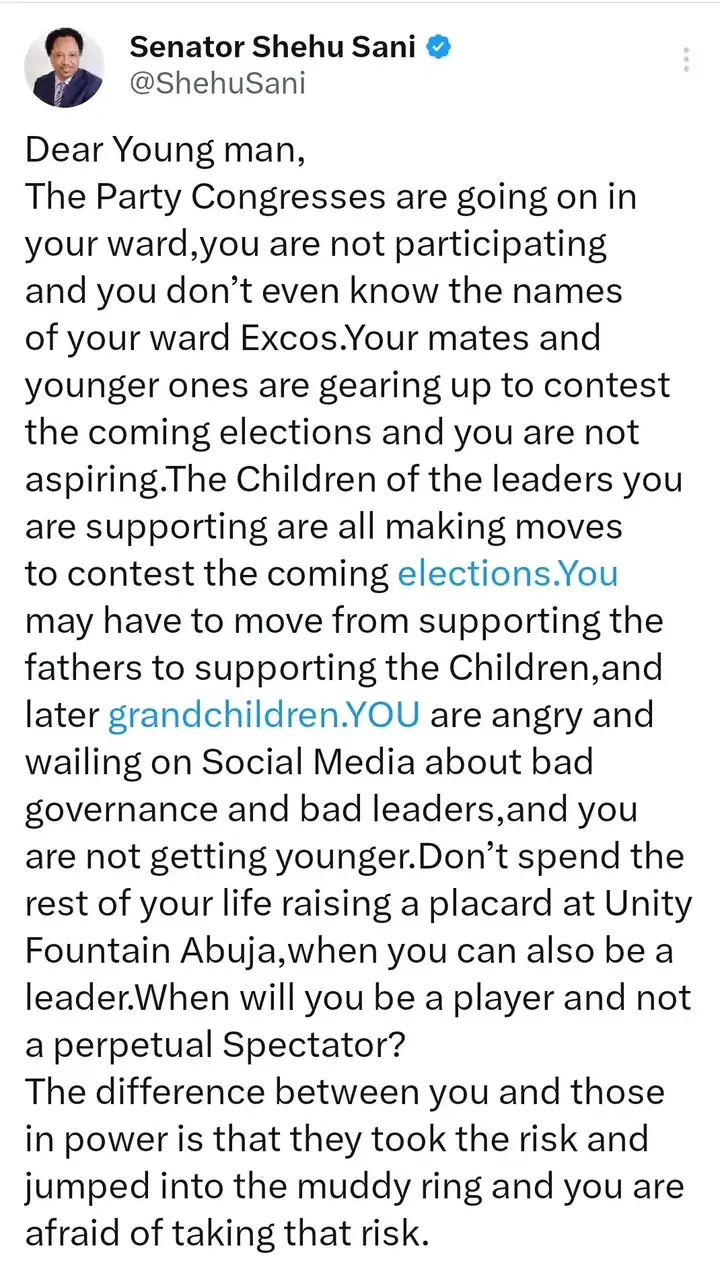 In a message published on his verified X account on April 12, 2026, Sani commented on what he termed the increasing disinterest among the youth during the ongoing party congresses occurring in various wards across the country. He observed that numerous young individuals are not involved in political events nor are they acquainted with essential party frameworks at the community level.