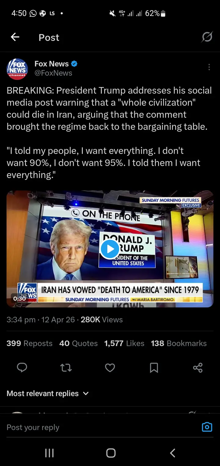“I told my people, I want everything. I don’t want 90%, I don’t want 95%. I told them I want everything,” Trump said, emphasizing that the United States is seeking comprehensive outcomes in the talks rather than partial concessions.