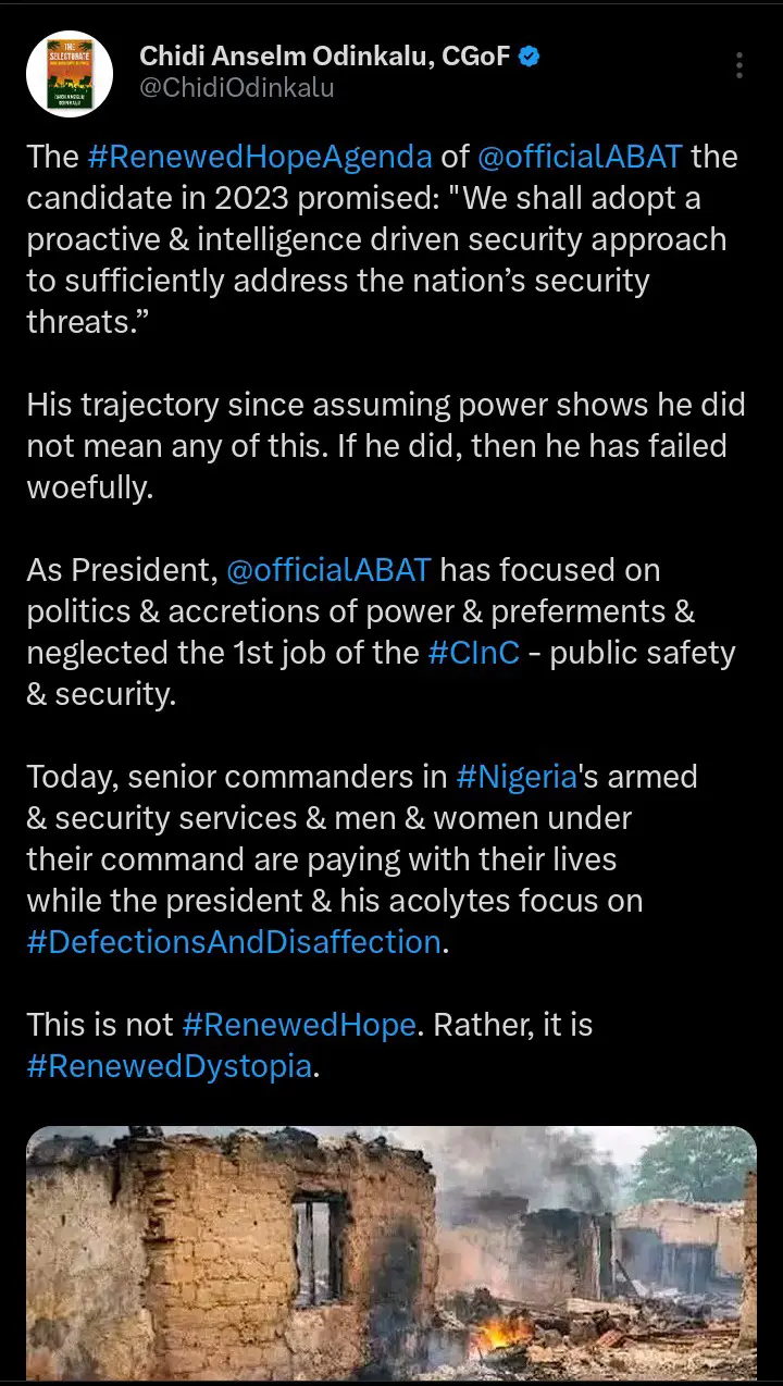 Odinkalu made his comments via his official X account, where he referenced commitments made during the 2023 election period, particularly assurances that a more proactive, intelligence-driven strategy would be adopted to address insecurity across Nigeria.
