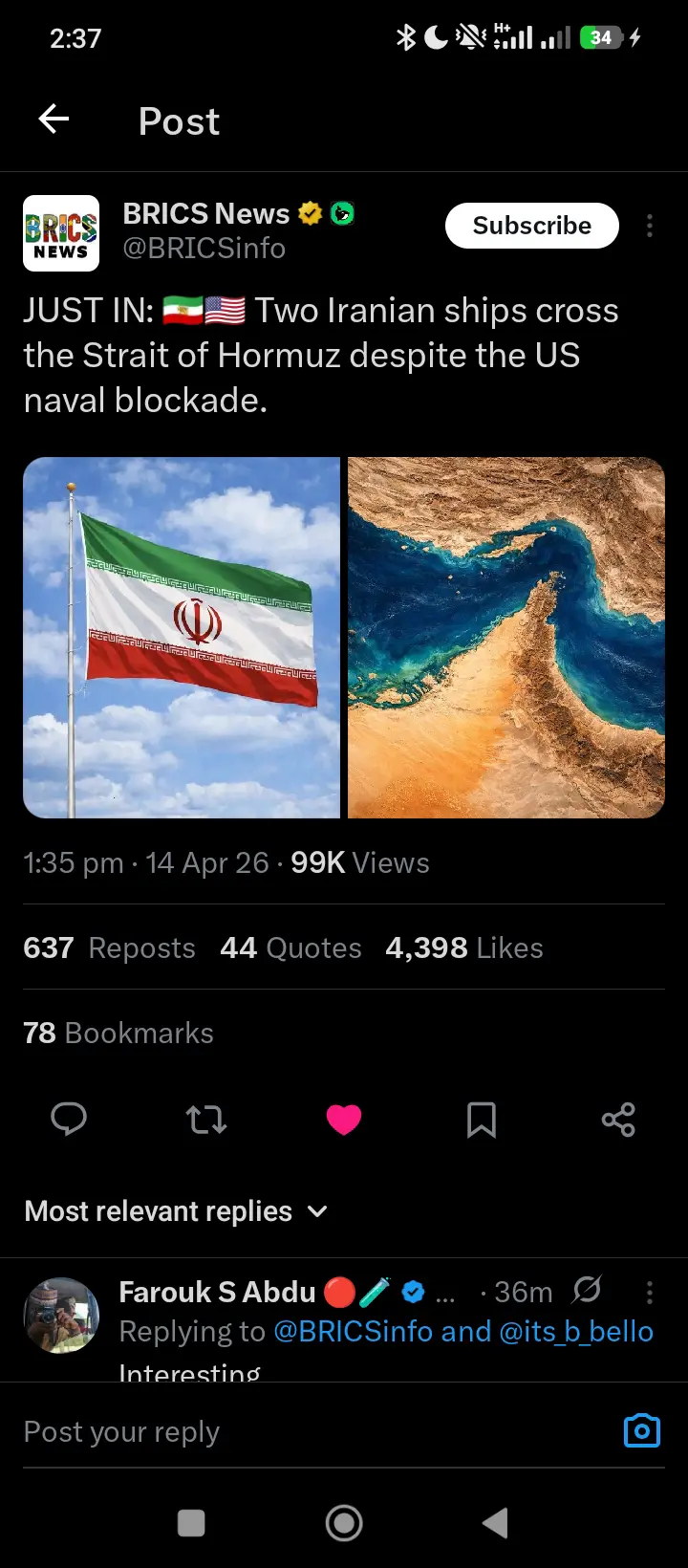 According to BRICS News on 14 April 2026, the development comes amid heightened tensions between Iran and the United States, with the critical shipping route remaining a focal point of global concern.
