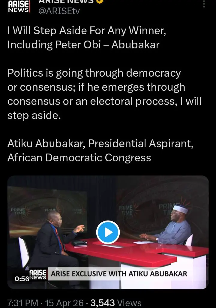 Atiku made the clarification during an exclusive interview on Arise News on Wednesday, where he addressed questions about possible alignments ahead of the 2027 elections.