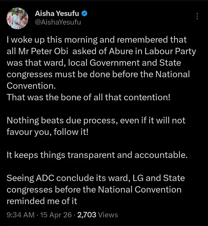 In a post on her X handle, she noted that the core disagreement was Obi’s insistence that ward, local government, and state congresses should be conducted before a national convention, stressing that due process remained essential in any democratic structure, even when it may not be personally favourable.