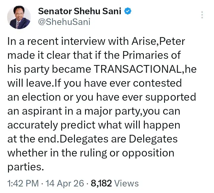 In his comment, Sani suggested that anyone with experience in Nigerian party politics—either as a candidate or a supporter—can often predict how primaries will unfold, regardless of public commitments to reform. He implied that while Obi’s stance reflects a principled position, the entrenched nature of delegate-driven politics may pose a significant challenge to achieving the level of transparency he seeks.