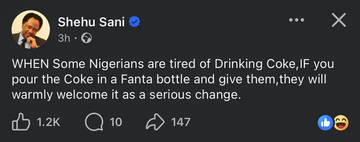 In a recent social media post, Sani wrote: “When some Nigerians are tired of drinking Coke, if you pour the Coke into a Fanta bottle and give it to them, they will warmly welcome it as a serious change.” The statement, though simple on the surface, has been widely interpreted as a critique of how political rebranding is often mistaken for genuine transformation.