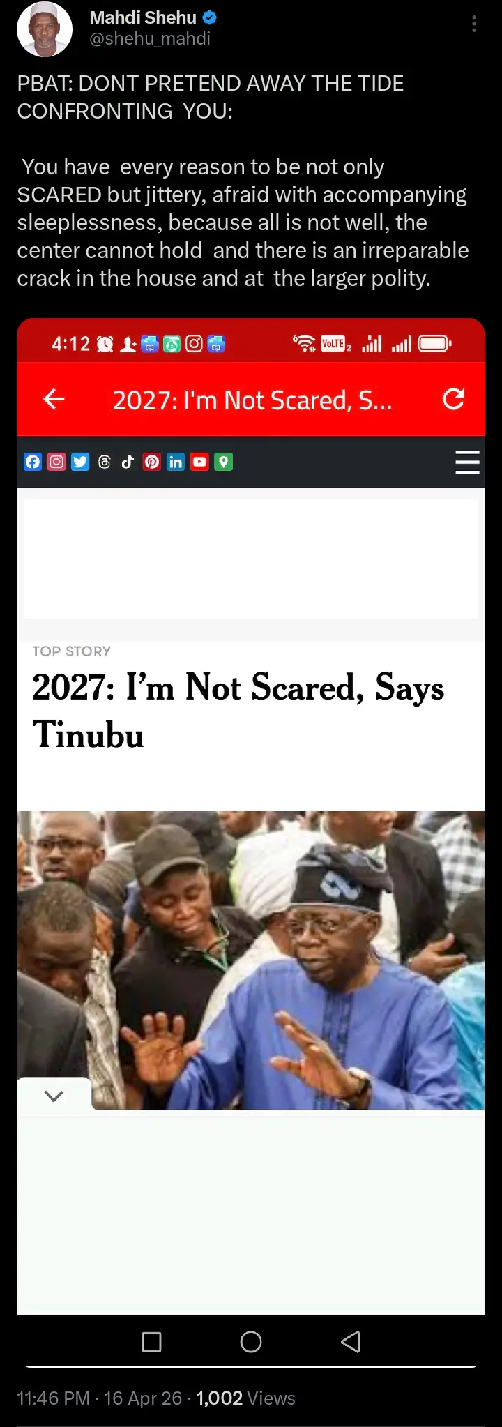 In a recent statement via his official X account, public affairs analyst Mahdi Shehu has warned President Bola Ahmed Tinubu against what he described as ignoring mounting political pressure ahead of the 2027 general elections.