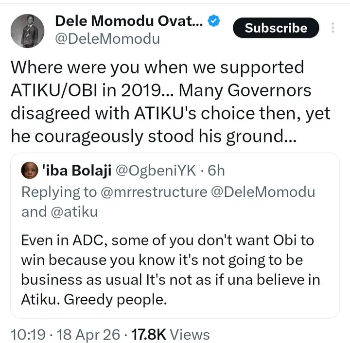 Reacting, Nigerian publisher and chieftain of the African Democratic Congress (ADC), Chief Dele Momodu, questioned where the man was when they supported ATIKU/OBI in 2019, noting that many governors disagreed with Atiku choosing Obi as his running mate at the time, but Atiku courageously stood his ground.