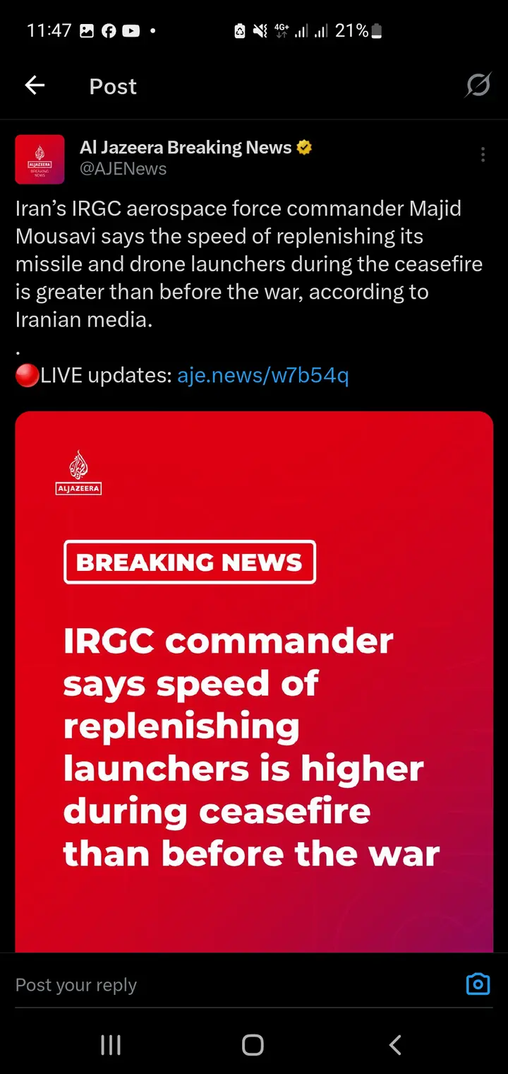 Iran’s Islamic Revolutionary Guard Corps (IRGC) Aerospace Force commander, Majid Mousavi, says Tehran is increasing the pace of replenishing its missile and drone launchers during the ceasefire period at a rate faster than before the conflict with the United States and Israel.