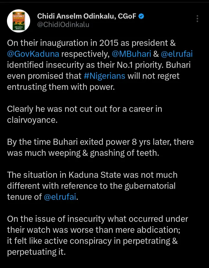 Chidi Odinkalu, a renowned human rights activist and legal practitioner in a recent statement which was shared on his official X handle, voiced his displeasure over the actions of the former governor and president Muhammadu Buhari.