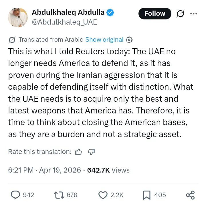 Describing American bases as a “burden” rather than a strategic asset, Abdulla suggested their continued existence may no longer align with the UAE’s evolving defense posture. His comments reflect a broader conversation within parts of the Gulf region about redefining long-standing security partnerships.