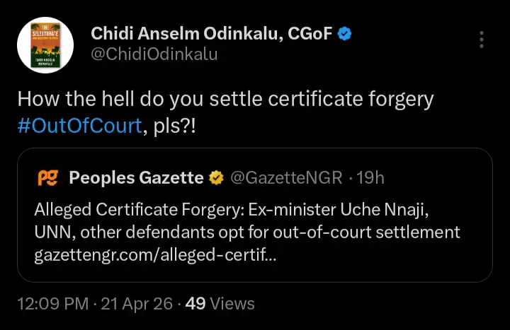 Chidi Odinkalu, a renowned human rights activist and former chairman of the national human rights commission has taken to his official X handle to react after the former minister for science and technology, Uche Nnaji decided to settle the school certificate case out of court. According to the statements which were shared on his official X handle, he pointed out that the decision must not be approved.