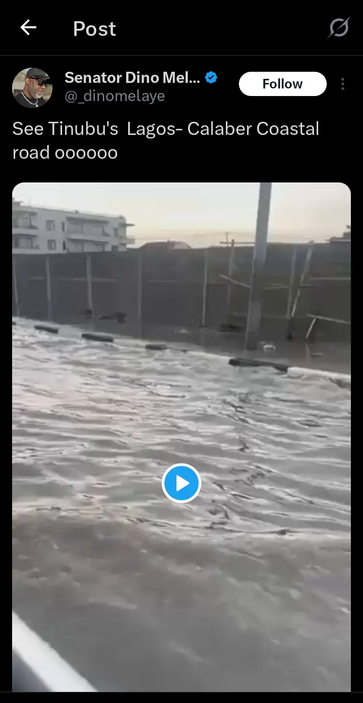 Sharing video of the Lagos-Calabar coastal highway flooded with water, the former Nigerian Senator and governorship candidate, Dino Melaye tweeted: “See Tinubu’s Lagos-Calabar coastal road oooo”