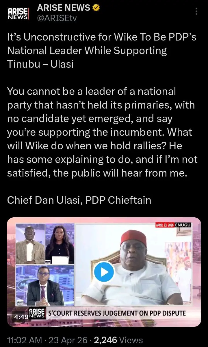 “You cannot claim to lead a national party that hasn’t yet held its primaries, with no candidate chosen, and say you’re supporting the current president,” Ulasi remarked.