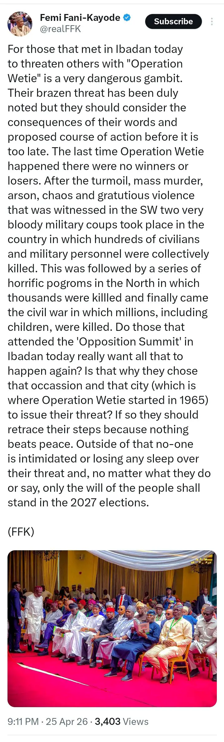 Following the development, Fani-Kayode took to social media platform X to express his concerns. He particularly reacted to references made at the summit to “Operation Wetie,” a phrase associated with the violent political unrest in Nigeria during the 1960s.