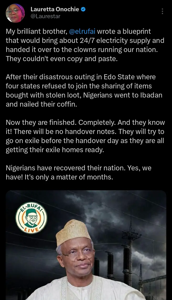 According to the statements which were shared on her official X handle, she pointed out that the former Kaduna governor wrote a brilliant blueprint that will bring about constant electricity supply.