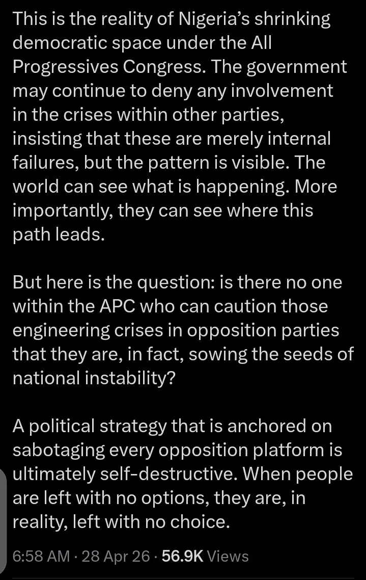 “The government may continue to deny any involvement in the crises within other parties, insisting that these are merely internal failures but the pattern is visible. The world can see what is happening. More importantly, they can see where this path leads”…….See More