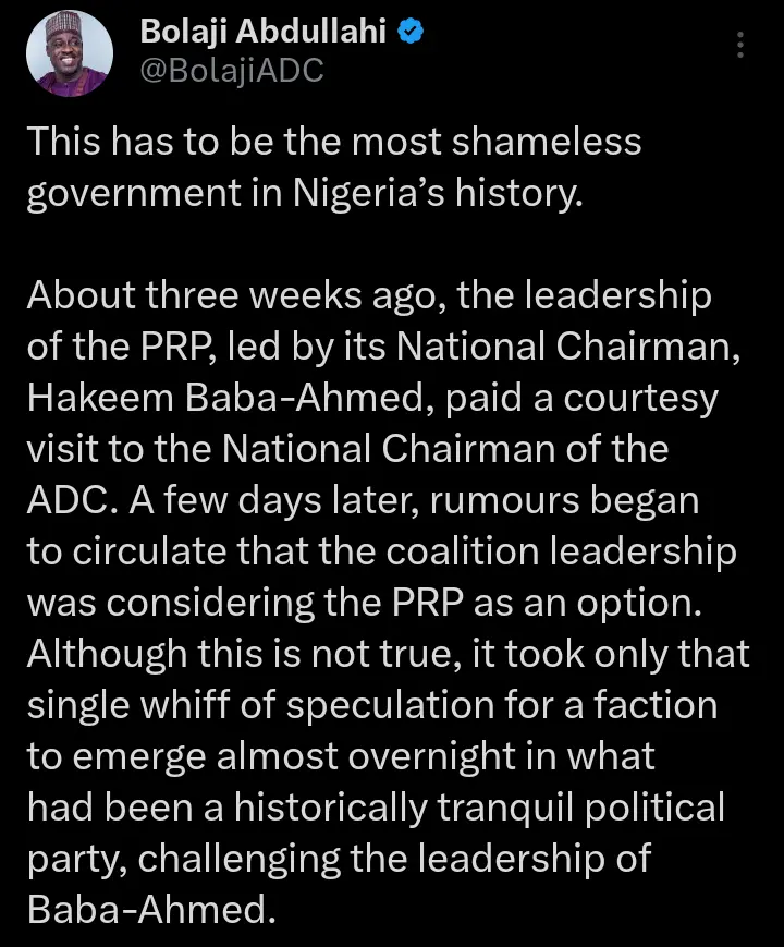 The National Chairman of the African Democratic Congress, ADC, Bolaji Abdullahi has taken to his official X account on Tuesday, April 28, 2026 to react to report that a faction has emerged in Peoples Redemption Party, PRP.